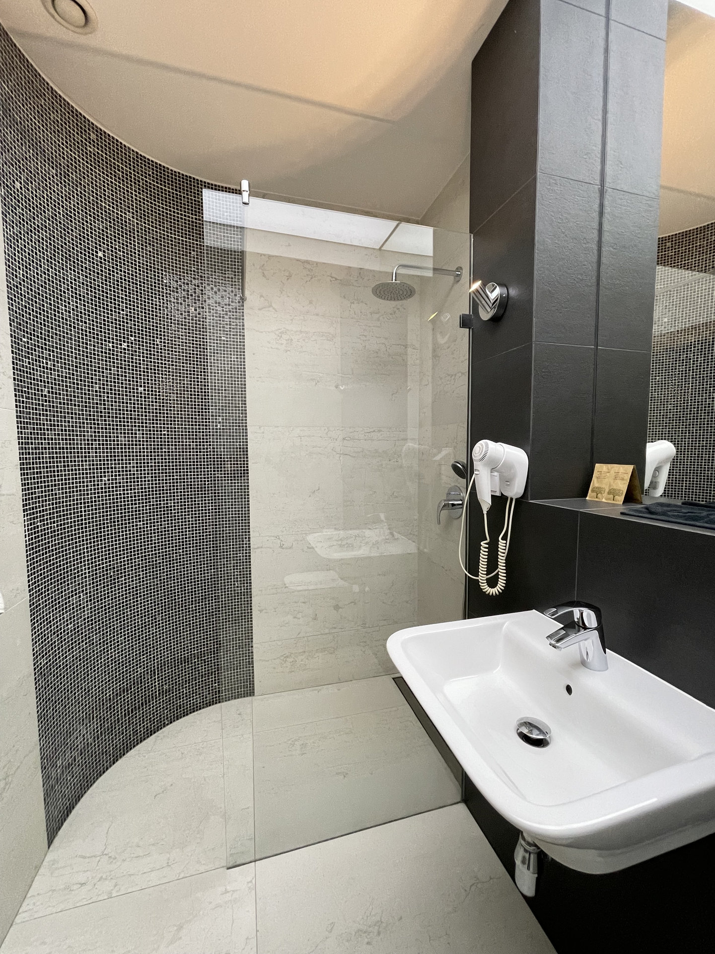 Elegancki, klimatyzowany pokój o powierzchni 17 m² oferuje duże, wygodne łóżko małżeńskie, przestronną szafę i prywatną łazienkę z prysznicem oraz zestawem kosmetyków. Wygodne rozwiązania, takie jak indywidualnie sterowana klimatyzacja i ogrzewanie, zapewniają komfort przez cały rok.
